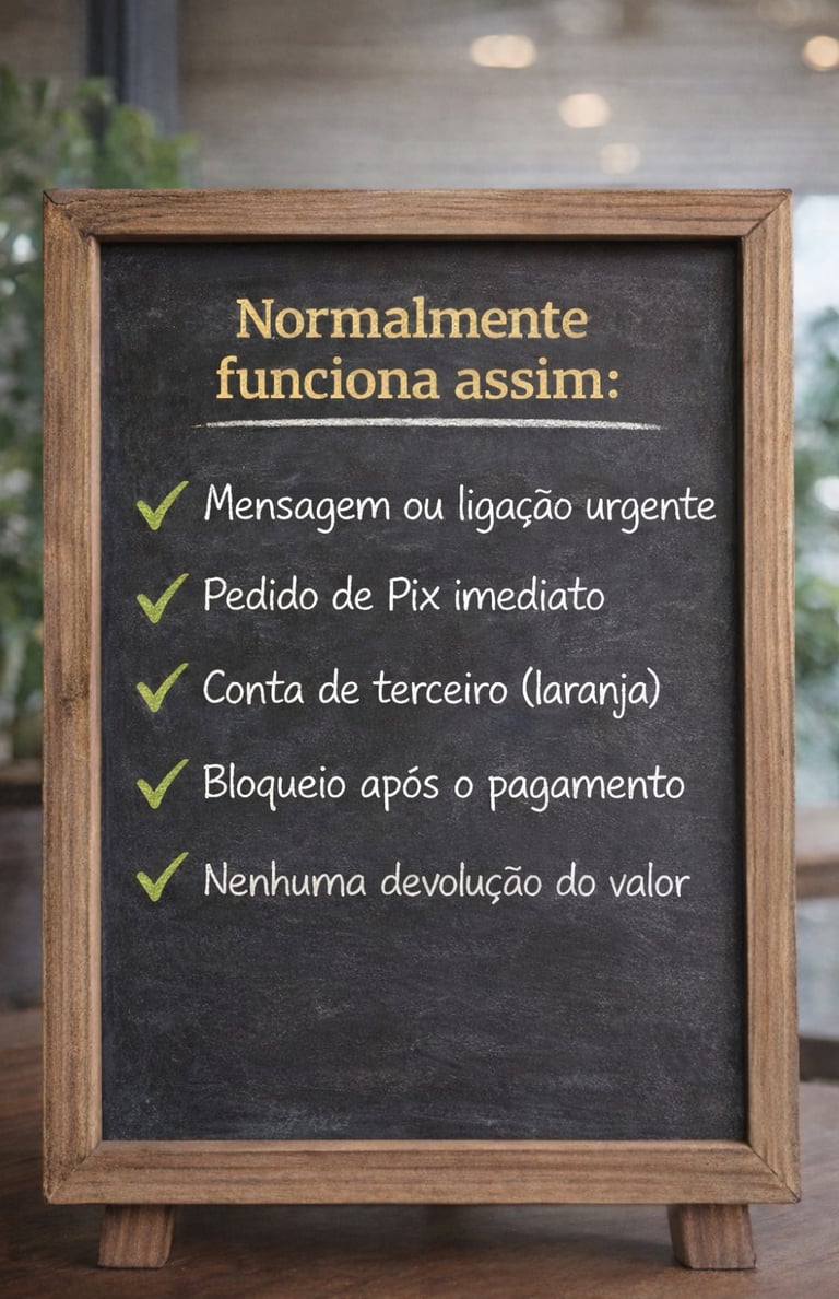 Criminosos usam perfis falsos, links fraudulentos ou engenharia social para induzir transferências imediatas.